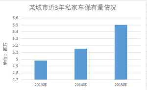 Emerging from the bar chart are the significant changes in the number of the private cars in a city during the period from 2013 to 2015. To be specific, the past three years has witnessed a steady increase in the number of the private cars from approximately 5 million to 5.5 million.