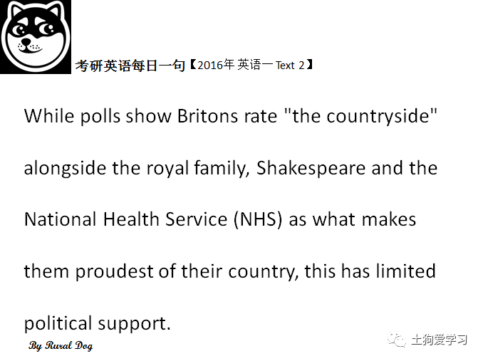 雖然民意調(diào)查顯示:英國人把 “鄉(xiāng)村"與王室、莎士比亞和國民保健制度(NHS)一起 認為是他們對自己國家最自豪的地方,但是這限制了政治上的支持(得到的政府支持有限)。