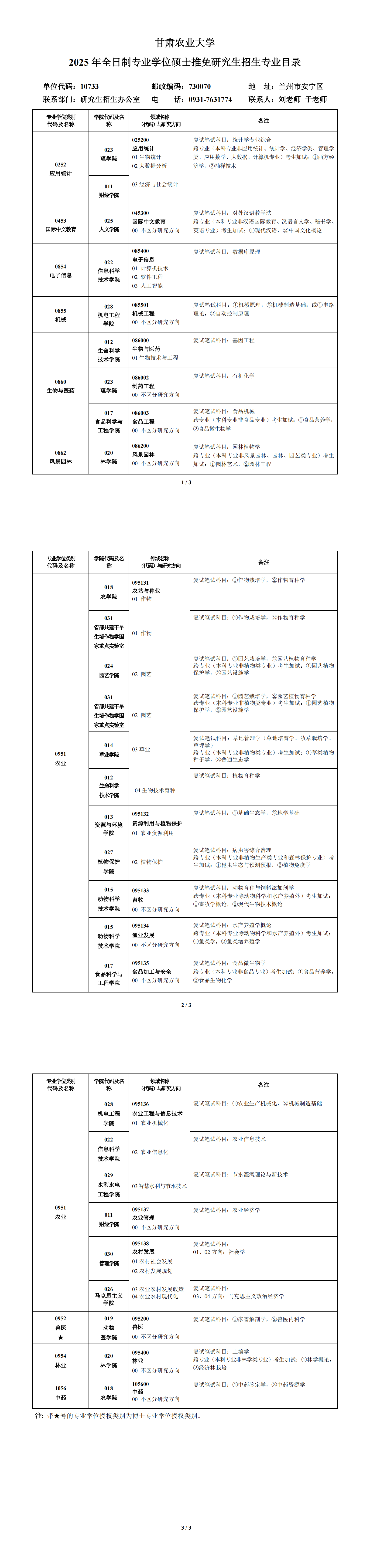 甘肅農業(yè)大學2025年全日制專業(yè)學位碩士推免研究生招生專業(yè)目錄