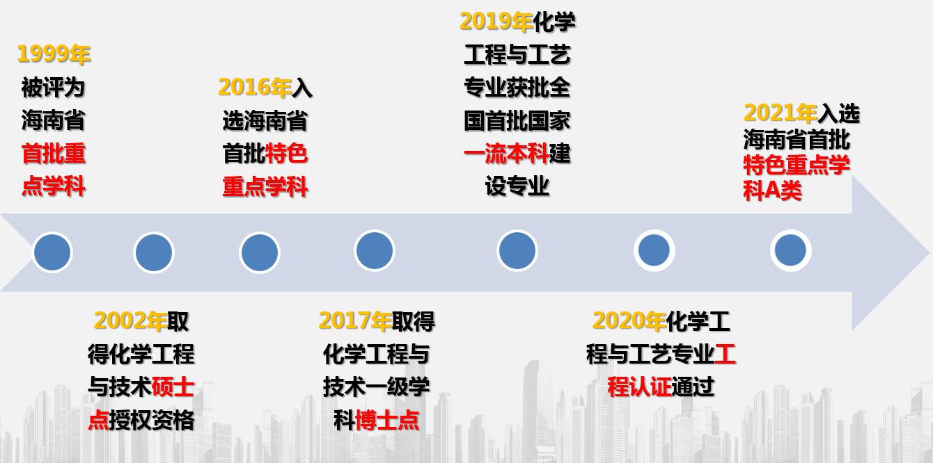 學(xué)院擁有化學(xué)工程與技術(shù)一級(jí)學(xué)科博士點(diǎn)、化學(xué)工程與技術(shù)一級(jí)學(xué)科碩士點(diǎn)、材料與化工類(lèi)工程碩士點(diǎn)及化學(xué)工程與工藝工學(xué)學(xué)士學(xué)位點(diǎn),具備完整的本碩博一體化培養(yǎng)體系。擁有海南省化學(xué)化工實(shí)驗(yàn)教學(xué)示范中心,校外教學(xué)實(shí)習(xí)基地13個(gè);擁有省級(jí)精品課程2門(mén),出版十三五規(guī)劃教材6部,獲省部級(jí)以上教學(xué)成果獎(jiǎng)2項(xiàng);瘜W(xué)工程與技術(shù)學(xué)科1997年被評(píng)為海南大學(xué)首批校級(jí)重點(diǎn)學(xué)科,1999年被評(píng)為海南省首批重點(diǎn)學(xué)科,2009年被中組部、中宣部、人社部、科技部聯(lián)合表彰為“全國(guó)杰出專(zhuān)業(yè)技術(shù)先進(jìn)集體”,2016年入選海南省首批特色重點(diǎn)學(xué)科,2021年被海南省評(píng)為省級(jí)特色重點(diǎn)學(xué)科A類(lèi)。