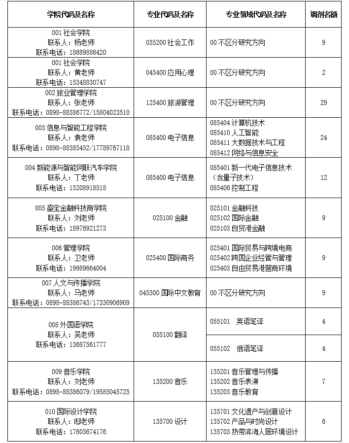 依據(jù)教育部《2025年全國碩士研究生招生工作管理規(guī)定》及海南省有關(guān)文件精神,為做好我校2025年碩士研究生招生調(diào)劑工作,根據(jù)學(xué)校一志愿考生擬錄取情況及招生計劃數(shù),現(xiàn)將調(diào)劑工作有關(guān)事項公告如下: