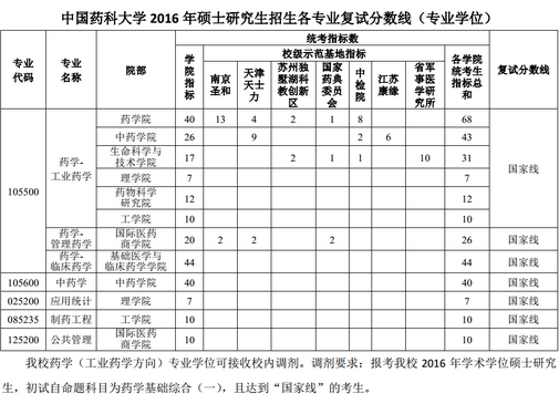 中國藥科大學2016年考研招生各專業(yè)復試分數(shù)線(學術學位)