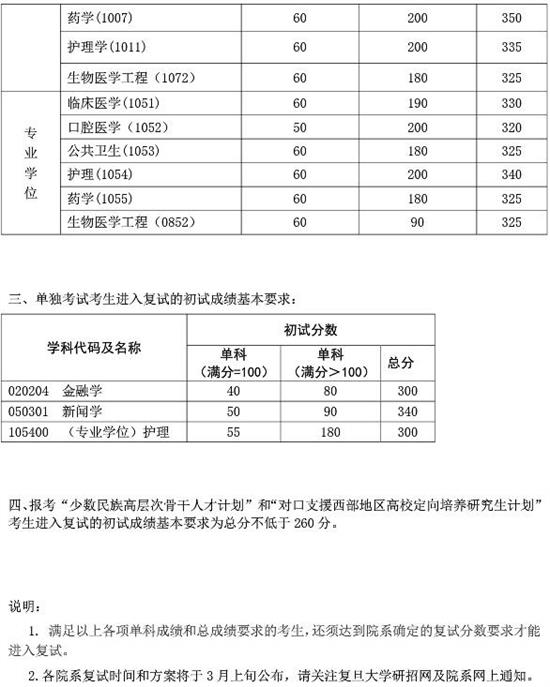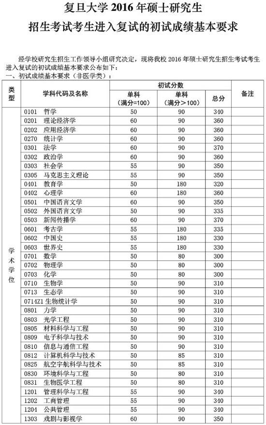 復(fù)旦大學(xué)2016年碩士研究生招生考試考生進(jìn)入復(fù)試的初試成績基本要求
