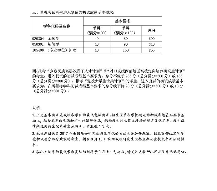 復(fù)旦大學(xué)2017年碩士研究生招生考試考生進(jìn)入復(fù)試的初試成績基本要求