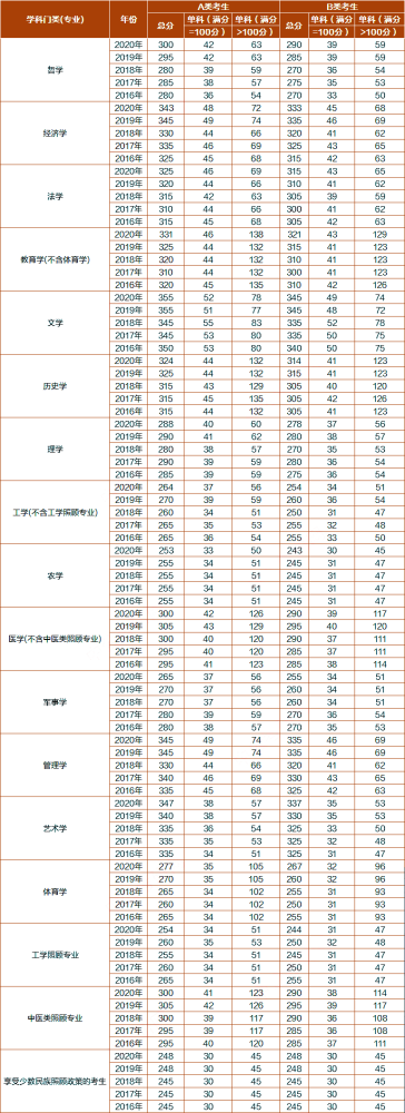 讓我們先看一下歷年國家線匯總(2016-2020),你初試要考多少分才有戲?以下的對(duì)照表一定要仔細(xì)看了!