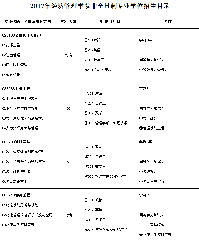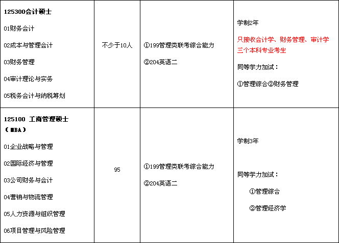 金融碩士、工業(yè)工程、項(xiàng)目管理、物流工程、會(huì)計(jì)碩士(MPAcc)等五個(gè)專(zhuān)業(yè),學(xué)制2年。