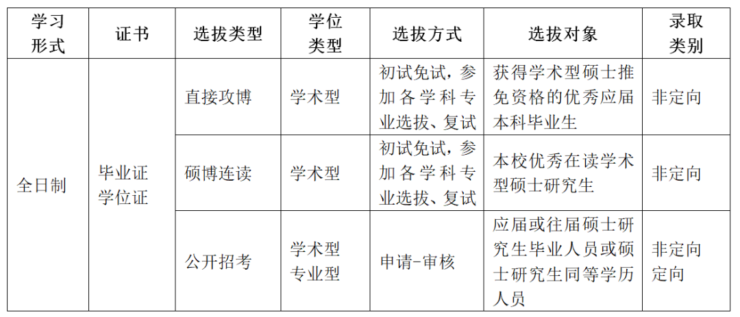 。ǘ┎┦垦芯可浫☆悇e分為“定向”或“非定向”(“少數(shù)民族高層次骨干人才研究生招生計劃”、“ 高校思想政治工作骨干在職攻讀博士學位專項計劃”、“援藏計劃”等均為“定向”)。