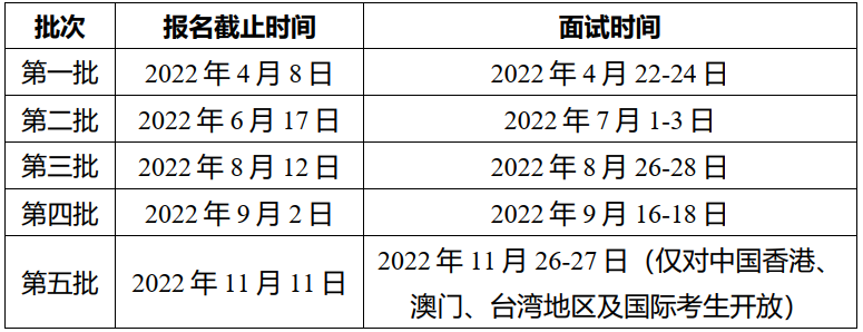資料齊全且通過審核后,學院將以電子郵件的方式給予反饋,在各批次報名截止時間后按照相應批次的面試時間統(tǒng)一安排面試。考生須攜帶考試通知上所要求的材料參加面試。面試時須攜帶所有資料原件進行資格審查。通過面試者將獲得條件錄取資格。