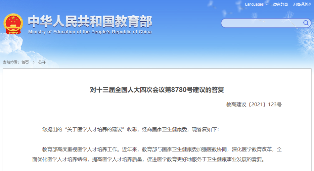 8月18日,教育部網(wǎng)站發(fā)布了《對(duì)十三屆全國(guó)人大四次會(huì)議第8780號(hào)建議的答復(fù)》(以下簡(jiǎn)稱(chēng)《答復(fù)》),答復(fù)了 “關(guān)于醫(yī)學(xué)人才培養(yǎng)的建議”。