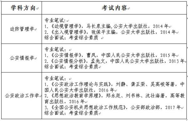 公安學(xué)一級學(xué)科下邊防管理學(xué)、公安情報學(xué)和公安政治工作學(xué)3個學(xué)科方向。