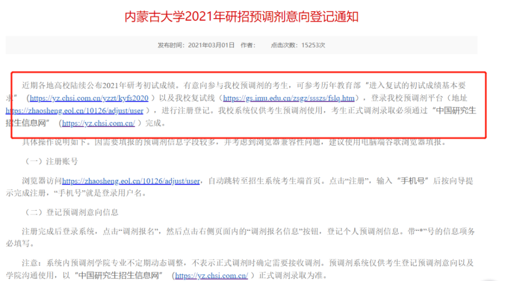3月1日,內(nèi)蒙古大學發(fā)布2021年研招預調(diào)劑意向登記通知:有意向參與我校預調(diào)劑的考生,可參考歷年教育部“進入復試的初試成績基本要求”以及我校復試線,登錄我校預調(diào)劑平臺,進行注冊登記。