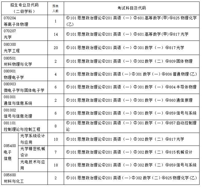 2022年我所計(jì)劃在等離子體物理、光學(xué)、光學(xué)工程、物理電子學(xué)、微電子學(xué)與固體電子學(xué)、信息與通信工程、信號與信息處理、控制理論與控制工程、材料物理與化學(xué)、電子信息、材料與化工等9個專業(yè)招收全日制碩士研究生100名左右,其中擬接收推薦免試碩士研究生20名左右。具體以國科大正式下達(dá)的2022年招生計(jì)劃為準(zhǔn)。